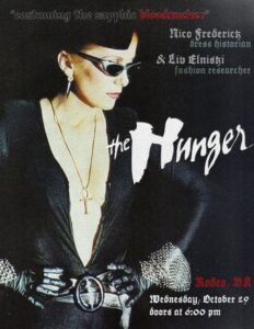 Alongside Dress Historian Nico Frederick, I spoke on costuming the Lesbian Vampire in film, followed by a screening of The Hunger (1983) starring Catherine Deneuve, Susan Sarandon and David Bowie. Our conversation began with the sapphic vamps predecessor, the early twentieth-century filmic archetype of the Vamp, embodied by Theda Bara and later Marlene Dietrich—ultimately culminating in Deneuve’s ultra-high fashion rendition. This event was planned and moderated by event programmer Anne Marie Dillon and held at Rodeo Bar in Brooklyn, New York.
