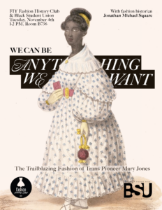 Dr Michael Square’s presentation covered the life and fashions of Mary Jones, a black transgender pioneer in nineteenth-century America, who dressed herself in the fashions of the 1830s—bustles, shawls, and bonnets. This presentation revealed that despite criminalization and repeated imprisonment, she was dedicated to her feminine self presentation. This event was hosted in collaboration with FIT’s Black Student Union.