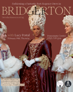This screening of an episode of Bridgerton (2026), introduced by fashion historian Lucy Postal, was co-hosted by FIT Costume Design Club. Her introductory presentation explored how costume design shapes the show’s world-building, arguing that Bridgerton functions as fantasy rather than historical drama—and that its intentionally inaccurate period dress has nonetheless sparked popular interest in fashion history. Postal is an MA candidate in Fashion and Textile Studies at FIT, with research focused on women’s historic dress and experience in museum and fashion archiving.