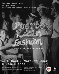 Historians Raúl J. Vázquez López and José Blanco F. explore how Puerto Rico’s colonial status has shaped its fashion history and identity, from traditional jíbaro dress to Miss Universe pageantry and Bad Bunny’s global stage. This event will be co-hosted by the FIT Latinx Culture and Career Association.